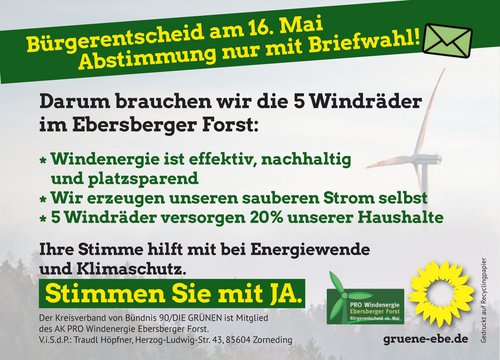 Um was geht es uns Grüne im Landkreis Ebersberg, die wir auch mit unserem Namen für die fünf Anlagen im Eberberger Forst werben? Um die Zukunft für uns alle. Um die Unabhängigkeit von Energieträgern aus Krisengebieten, die Unabhängigkeit von fossilen Energien, um Klimaschutz und darum die Erdüberhitzung einzugrenzen.