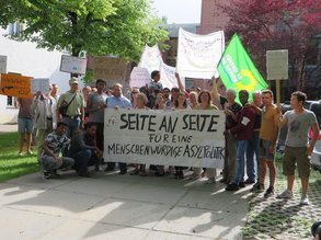 Zwischen den Reden machte die ganze Gruppe mit lautstarken Parolen auf sich aufmerksam und war bis zum Eintreffen des Ministerpräsidenten nicht zu überhören und zu übersehen.