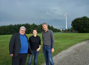 Am Ende ihrer Tour durch den Landkreis Ebersberg bestaunen die beiden Grünen Abgeordneten und die junge Kandidatin für das Ebersberger Direktmandat vor aufziehenden dunklen Gewitterwolken das sichtbarste Zeichen der hiesigen Energiewende: das Hamberger Windrad in der Gemeinde Bruck. Ein seltener Anblick in Oberbayern – denn südlich von München kann man große Windkraftanlagen an zwei Händen abzählen. Die restriktive 10H-Abstandsregel der CSU-Staatsregierung hat den Ausbau fast vollständig zum Erliegen gebracht und die Energiewende ausgebremst.