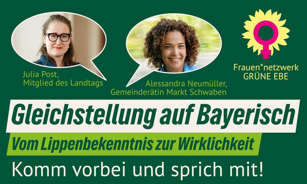 Diese Veranstaltung lebt von unser aller Expertise! Wir diskutieren zusammen mit Alessandra Neumüller, engagiert für Frauen und Gemeinderätin in Markt Schwaben und natürlich mit Dir. Gemeinsam suchen wir dann nach Wegen, wie wir Gleichstellung vor Ort bei uns in die Alltagswirklichkeit bringen können.