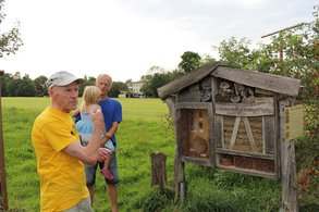 Noch einmal schwangen sich die Interessierten auf das Fahrrad und fuhren Richtung Altpoing zur Streuobstwiese am Moorweiher. Diese geht auf einen Antrag der Grünen aus dem Jahr 2011 zurück und ist ein wichtiger Rückzugsort für Flora und Fauna in Poing. Insbesondere für Bienen stellt die Streuobstwiese ein wichtiger Lieferant für Nektar dar, was Ludwig Huber, Vorsitzender des Gartenbauvereins, unterstrich. Er erklärte eindrucksvoll, was für Leistungen die Bienen vor allem innerhalb ihres Bienenstocks vollbringen.
