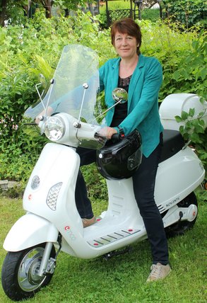 Unterwegs ist sie dabei mit ihrem Elektro-Roller, der klimaschonend mit Sonnenenergie von ihrem Solardach betrieben wird.