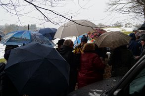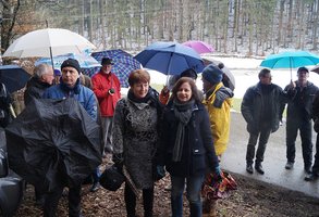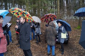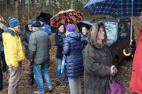 Trotz Kälte und Regen hatten sich neben dem Grundstück des geplanten Schweinestalls etwa 30 Interessierte eingefunden. So konnte Herr Lehnberg von der Initiative auch Olaf Rautenberg und Klaus Schöffel vom Bund Naturschutz und Bianka Poschenrieder von der SPD begrüßen. Auch der Bauwerber Herr Murr kam zusammen mit seinem Planer zu der öffentlichen Ortsbegehung.