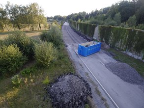 Dem Betrachter bietet sich denn auch ein Anblick wie bei einem Straßenneubau: Etwa einen halben Meter tief wurde die Erde entfernt; einstmals viel gelobtes Geotextil liegt zu Kubikmeter-großen Haufen aufgeschichtet am Straßenrand und wird nun wohl durch neues Plastik ersetzt.