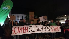 Die GRÜNEN in Vaterstetten hatten zur Demo aufgerufen, und über 100 Teilnehmer kamen!. Sie zogen am Donnerstag Abend vor der letzten Gemeinderatssitzung vor der Kommunalwahl vor das Rathaus, um gegen die Machenschaften des AfD-Gemeinderates Manfred Schmidt bei der Kandidat*innen-Aufstellung zu protestieren und seinen Rücktritt zu fordern.