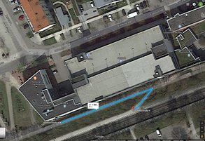 Nun ist am östlichen Ende der Baustelle aber noch ein breiter gerodeter Geländestreifen. Das sollte für den Bau einer provisorischen Treppe ausreichen. Der dadurch eingesparte Fußweg ist auf dem Plan skizziert und beträgt rund 90 Meter, also über eine Minute. Hinzu kommt ggf. noch der Weg auf dem Bahnsteig bis zum Ende eines S-Bahn-Vollzugs. Diese Zeit kann schon entscheidend sein, ob man eine S-Bahn noch erreicht oder nicht, besonders wenn man den Bus gewählt hat, weil man nicht ganz so flott zu Fuß ist.