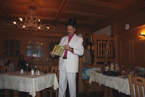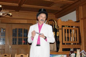 Auktionator Benedikt Mayer legte sich mächtig ins Zeug, schließlich ist der Kreisrat aus Emmering Kassier beim Verein "Ebersberger Nachtexpress e.V." Extra hatte sich Mayer für diesen Anlass in einen piekfeinen weißen Nadelstreifenanzug geworfen, ein Zylinder durfte natürlich auch nicht fehlen. "Es macht mir einfach viel Spaß euch das Geld aus der Tasche zu ziehen", begrüßte der Auktionator die Gäste. Die hatten vorher schon den "Gabentisch" inspiziert und warteten auf das passende Schnäppchen - und auf Benedikt Mayers flotte Sprüche. Nichts lies er unkommentiert, gnadenlos wurden auch die weniger begehrten Teile in den höchsten Tönen und mit Erfolg angepriesen. Und schon ging es Schlag auf Schlag weiter: Zwei braune Keramikkatzen fanden ebenso ihre Abnehmer wie eine Ausstechform der Münchner Frauenkirche, eine Dose Aachener Pinten, edles Parfum, zahleiche Bücher und Fotobände oder ein Taschenmesser mit zehn verschiedenen Funtionen. "Alles, was man für einen Gefängnisausbruch braucht", fiel Mayer dazu ein. Er scheute sich auch nicht eine CD von Mozart zuammen mit einer von AC/DC zu versteigern ("Auch wenn ihr nur eine wollt, ihr bekommt beide"), einen Türkranz mit einer Tube Handcreme ("Wenn hier jemand anfängt zu überlegen ist das falsch") oder Deko-Ostereier mit einer Schmuckkerze ("Das wird den Neid ihrer Nachbarn erwecken"). Manches Geschenk wurde der Auktionator mit "einem Seufzer der Erleichterung" los, um begehrte Sachen entbrannte aber oft ein heißes Wettbieten. Auch der selbstgemachte Eierlikör ("Ist es ihnen schon mal aufgefallen, dass bei so etwas nie Männer mitbieten?") und die edlen Parlinen ("Das Geschenk fiel wohl mit einem Weight-Watcher-Kurs zusammen") fanden ihre Abnehmer. Das ungeliebte Weihnachtsgeschenke einen guten Zweck erfüllen und zahlreichen Menschen einen fröhlichen Nachmittag ermöglichen können, bewies die Veranstaltung der Grünen auch in diesem Jahr wieder.