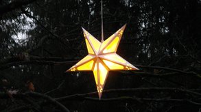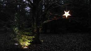 Ziel war eine kleine Waldlichtung mit einer stämmigen Eiche und einem großen, leuchtenden Stern, der vom Bühnenbildbastler Günter Glier dekoriert wurde. Doch noch bevor man diesen sah wurde es dunkel und Sternschnuppen gleich schaukelten unzählige kleine Stirnlämpchen durch den finsteren Wald – weihnachtlich fürwahr.