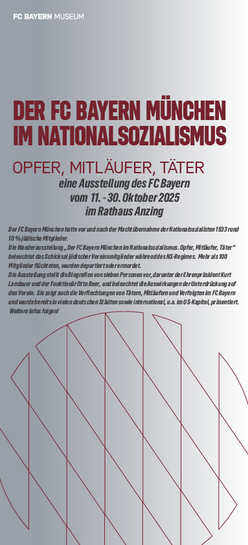 „Rot gegen Rassismus“ steht auf dem T-Shirt, mit dem der FC Bayern Farbe bekennt. Und es steht als Motto über der Ausstellung „Opfer, Mitläufer, Täter – Der FC Bayern München im Nationalsozialismus“. Sie ist vom FC Bayern Museum zusammengestellt worden, wird als Wanderausstellung kostenlos zur Verfügung gestellt und wurde von den Grünen nun ins Anzinger Rathaus geholt.
