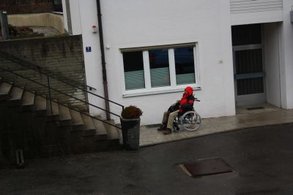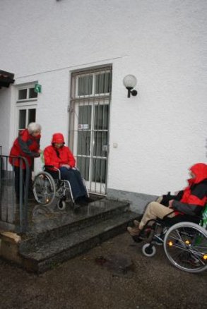 Einige Strecken unseres Weges waren zwar grundsätzlich machbar, aber recht beschwerlich: der Apothekerberg etwa ist ziemlich steil; Kinderwägen lassen sich mit Kraftaufwand den holprigen Weg hinaufschieben, aber für Rollstuhlfahrer ist der Weg ohne Hilfe nicht befahrbar. Noch steiler ist die Rampe zur Kirche; zu hoffen ist, dass sich wenigstens hier immer genügend hilfsbereite Hände finden.