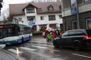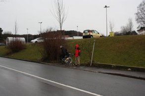 Andere Wegstrecken sind geeignet Furcht einzuflößen, bzw. objektiv gefährlich: der Gehweg an der Professor-Lebsche-Straße kurz vor der Ecke zur Feldkirchener Straße ist außerordentlich schmal: wenn hier ein LKW einem entgegenkommenden Bus begegnet, ragt eines der Fahrzeuge schon mal gefühlt bis auf den Gehweg, und auch einem unbefangenen Menschen kann dann beklommen zumute werden. Selbst ohne solche Begegnungen ist die Stelle für breitere Kinderwägen oder Rollstühle sehr eng, und schnell hängt eines der Räder über die Gehwegkante hinaus in der Luft. Der Gehweg auf der anderen Straßenseite ist wegen Stufen und Engstellen noch schlechter befahrbar. Wenn die Parkplätze vor den Läden benutzt sind, sieht man immer wieder Leute auf die Straße ausweichen: ein unhaltbarer Zustand. Häufig stießen wir auf kleine Hindernisse, die das Fahren mühsam und beschwerlich machten: Gehsteigkanten ohne Abschrägung, Rinnen in denen sich die kleinen Räder verfangen und feststecken.