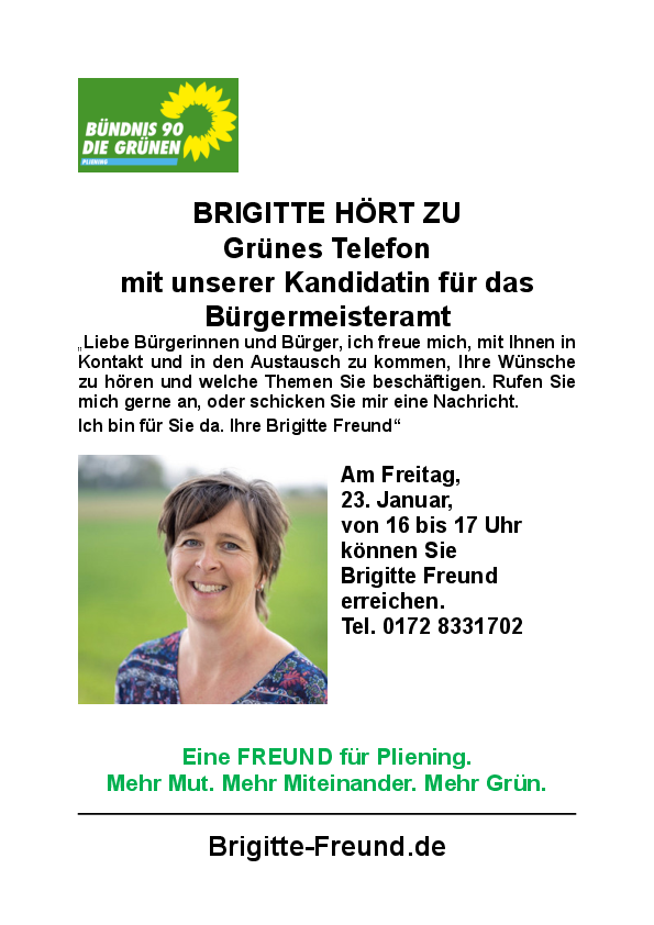 Brigitte Freund freut sich auf viele Fragen der Bürger*innen. Einfach anrufen und mit ihr ins Gespräch kommen. am Freitag, 23. Januar, von 16 bis 17 Uhr unter der Nummer 0172 8331702