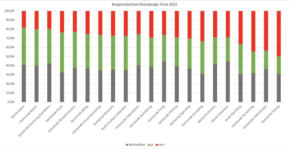 Glonn stimmt klar mit JA beim Bürgerentscheid zu den geplanten 5 Windrädern im Ebersberger Forst. Über 69% der Glonner*innen haben ihre Ja-Stimme abgegeben - in Zahlen sind das 1645 JA-Stimmen - und das bei einer Bürger*innen-Beteiligung von knapp 59%.