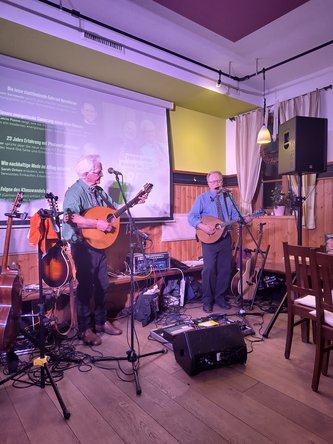 Zu einem informativen und musikalischen Freitagabend luden die Grünen gut eine Woche vor der Kommunalwahl in die Landlust Vaterstetten ein. Dabei spielte die Band „Matching Ties“ auf, die sich seit 1986 dem irischen, britischen und schottischen Folk verschrieben hat und diesen auf Europas Bühnen präsentiert. Das Duo aus dem US-Amerikaner Paul Stowe und dem Briten Trevor Morriss sorgte mit Mandolinen, 6- und 12-saitigen Gitarren, Mundharmonika und Steel Guitar für ordentlich Stimmung im vollen Bürgermeisterstüberl.