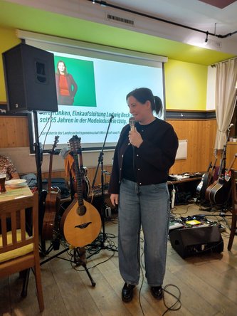 - Sarah Onken erläuterte die Auswirkungen von Fast Fashion: Die Modeindustrie ist für 3-10% der weltweiten Treibhausgasemissionen verantwortlich, bei Herstellung und Entsorgung werden Menschenrechte und Umweltstandards missachtet. Wie es besser gehen kann: Weniger, dafür qualitativ hochwertigere und miteinander kombinierbare Kleidungsstücke kaufen, am besten aus natürlichen Materialien.