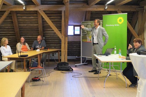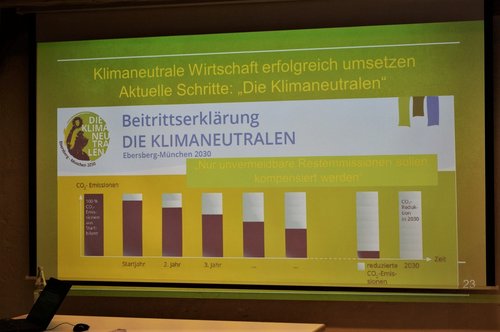 "Das muss nun runter auf Null", kommentierte unser Bundestags-Kandidat. Erreichen will er dieses Ziel vor allem durch den Ausbau der Photovoltaikanlage auf dem Firmendach, den Umstieg auf Elektroautos mit Ladestationen auf dem Firmengelände, Wärmedämmung, unter Umständen das Nutzen von Geothermie, das Downsizen von Gebäudeflächen, Digitalisierung und womöglich auch eine Bereinigung des Portfolios. Dass der Dschungel der Förderungen und Subventionen dabei oft kaum überwindliche Hürden setzt, hält er für untragbar. Aufgabe der kommenden Bundesregierung sei, mehr Anreize für den Umbau zu schaffen, etwa durch Einführen der Gemeinwohlökonomie, und die bürokratischen Hürden zu minimieren.