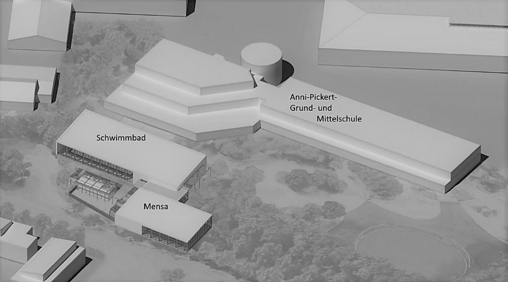 Na gut, ganz so weit ist es noch nicht. Aber auf der letzten Gemeinderatssitzung wurden die nächsten Schritte für den Neubau des Schwimmbads sowie der Mensa angegangen. Poing wird ein reines Schulschwimmbad mit Nutzung durch Vereine bekommen, aber technische Voraussetzungen für eine Öffnung für die Allgemeinheit sind vorgesehen.