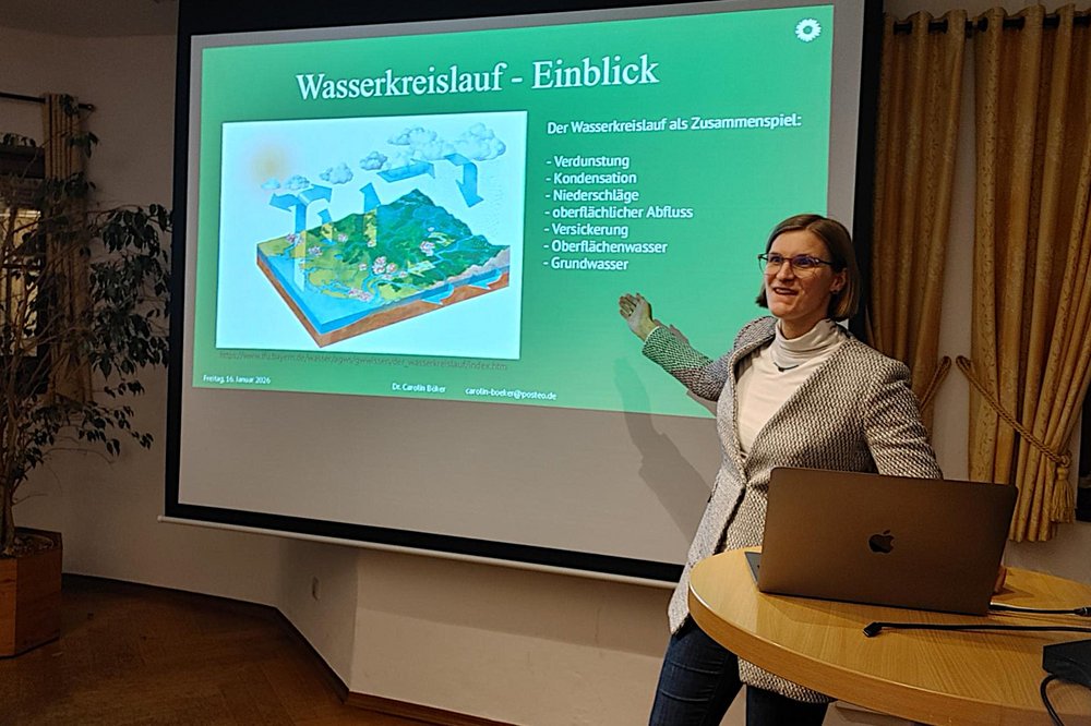 In ihrem Vortrag im gut gefülltem Ratszimmer in Aßling beleuchtete Dr. Carolin Böker* die Bedeutung von Wasser als unser wichtigstes Lebensmittel und die Herausforderungen, vor denen Gemeinden im Hinblick auf den Wasserkreislauf stehen. Der interessante Vortrag führte uns vor Augen, welche Faktoren sich negativ auf die Wasserökosysteme auswirken. Dass das aber nicht so sein muss, dafür gibt es auch Lösungen - die gilt es umzusetzen!