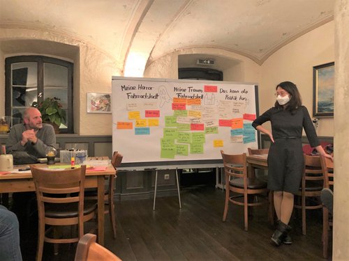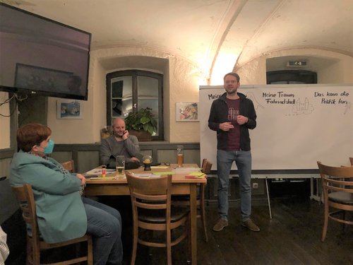 In der von der dritter Bürgermeisterin und Kreisrätin Lakhena Leng geleiteten Diskussion waren dann die Teilnehmenden an der Reihe, ihre Fahrrad-Träume zu skizzieren. Stadtrat Michael Schulze-Langforth erinnerte an den Einbahnstraßenring zwischen Marienplatz, Kreisklinik und Bahnhof, der für wenige Jahre den Verkehrsfluss beruhigt und für zu Fuß gehende und Rad fahrende sicherer gemacht habe. Geschäftsleute und lokale Autofahrer-Lobby hätten dann im Einklang mit der CSU den Fortschritt wieder rückgängig gemacht, bedauerte Schulte-Langforth. Ortsvorstand Claudia Peter spann den Faden weiter. Sie träume von einem in Ortschaften grundsätzlich im Einbahn-System geführten PKW-Verkehr, sagte sie. Dann wäre auch Tempo 30 kein Problem mehr, da dieses System ohnehin keine höheren Geschwindigkeiten erlaube. Die andere Straßenseite solle für den Begegnungs-Radverkehr reserviert werden. Damit wäre der Straßenraum auch breit genug für Lastenräder. Ein solches System müsse von vielen Maßnahmen flankiert werden, hieß es in der Debatte. Dazu gehören Fahrrad-Stellplätze an Bushaltestellen oder gar Bus-Anhänger zur Mitnahme von Fahrrädern sowie mindestens in den Außenästen der S-Bahn ein Recht auf Fahrrad-Mitnahme ohne Sperrzeiten. Das habe sich beispielsweise im Berliner Nahverkehr bestens bewährt.