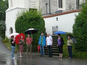 Der Blick in die aus Tuffstein gebaute spätgotische Kirche St. Aegidius war der Gruppe nicht möglich, sie war verschlossen. Benedikt Mayer, selbst aktiver Katholik, kennt die Kirche natürlich und hat auf den Aßlinger Kirchenwegweiser verwiesen, den es in der Bücherstube in Aßling zu kaufen gibt.
