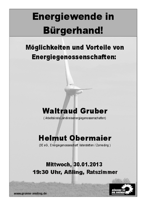 Ziel der Energiegenossenschaften ist die Realisierung nachhaltiger Projekte im Bereich der regenerativen Energien. Dies soll dezentral mit finanzieller und ideeller Bürgerbeteiligung geschehen und auch größere Anlagen ermöglichen. " Über das Genossenschaftsmodell wird ein einfacher Weg eröffnet um die Stromnetze vor Ort zu übernehmen und kommunale Energiewerke zu gründen" so Waltraud Gruber.