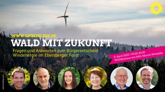 Aber wie lässt sich Klimaschutz und Waldschutz vereinbaren? Welchen Beitrag leisten 5 Windenergieanlagen im Forst zur Energiewende? Welche politischen Rahmenbedingungen verhindern die Windenergie in Bayern? Wie können unsere Bürgerinnen und Bürger im Landkreis davon profitieren? Was sind Fakten und was sind bloße Behauptungen im Vorfeld des Bürgerentscheids für die 5 Windenergieanlagen im Ebersberger Forst? Diese Fragen erörtetenn wir zusammen mit MdL Martin Stümpfig, dem Sprecher der Grünen Landtagsfraktion für Klimaschutz und Energie; Hans Gröbmayr, Fachreferent Energie; Marina Ruoff, Grüne Jugend; Fritz Gerneth, Vorstand der Bürgerenergie im Landkreis Ebersberg eG (BEG), Christoph Lochmüller, Kreisvorstand und Bundestagskandidat des Wahlkreises Ebersberg/Erding. Waltraud Gruber, Fraktionssprecherin der Grünen Kreistagsfraktion, moderierte souverän das Online-Seminar, das am 8.4.21 statt fand.