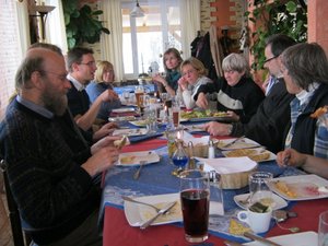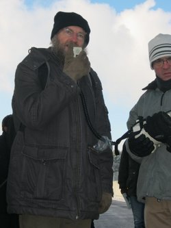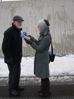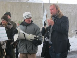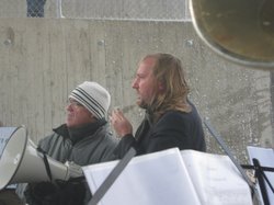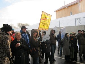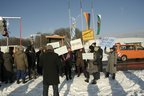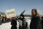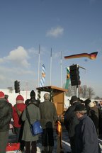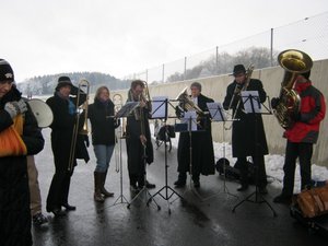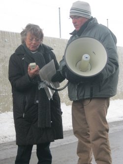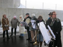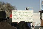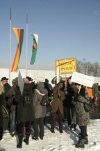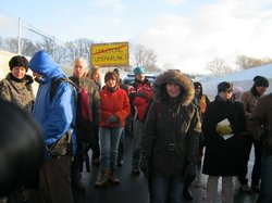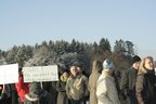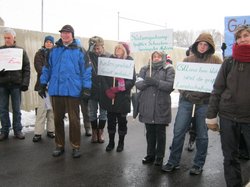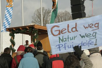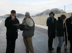 Wir nahmen das nicht sang- und klanglos hin, sondern protestierten mit Hilfe des Posaunenchors der Ebersberger Heilig-Geist-Kirche gegen die mindestens 25 Millionen € teure Naturzerstörung. Trotz eisiger Kälte versammelten sich werktags um neun Uhr morgens rund 50 Straßengegner zum gemeinsamen Abgesang auf Laufinger Moos und angrenzende Wiesen und Felder. Prominenten Beistand erhielten wir von Toni Hofreiter und Heiner Müller-Ermann, der den Widerstand gegen die Isentaltrasse koordiniert. Aus unseren eigenen Reihen sprachen Käte Moder und Dieter Berberich, selbst Betroffene und jahrelange - letztlich erfolglose - Kämpfer für eine naturschonende Alternativtrasse.