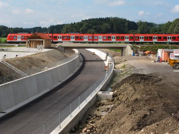 "Die Baustelle hat es in sich. Schlechterer Untergrund als geplant, deshalb Einbau eines Vlieses, zusätzlich notwendig gewordene Grundwasserwannen, abgesoffene Baugruben und Unterführungsbauwerke, Risse an Häusern im Laufinger Moos, die genau zu der Zeit auftraten, als die Lärmschutzwände in den Boden gerammt wurden, absinkende Trasse und allgemein Probleme mit der Wasserhaltung [...]"