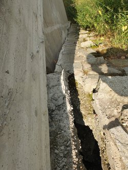 Ausserdem zebröckelt die gemauerte Steinauflage, die ca. 80 cm breit neben der Brücke auf dem Erdreich aufgebracht war. Gleichzeitig entfernt sich die gesamte Aufschüttung inklusive der vermörtelten Steinauflage seitlich weg von