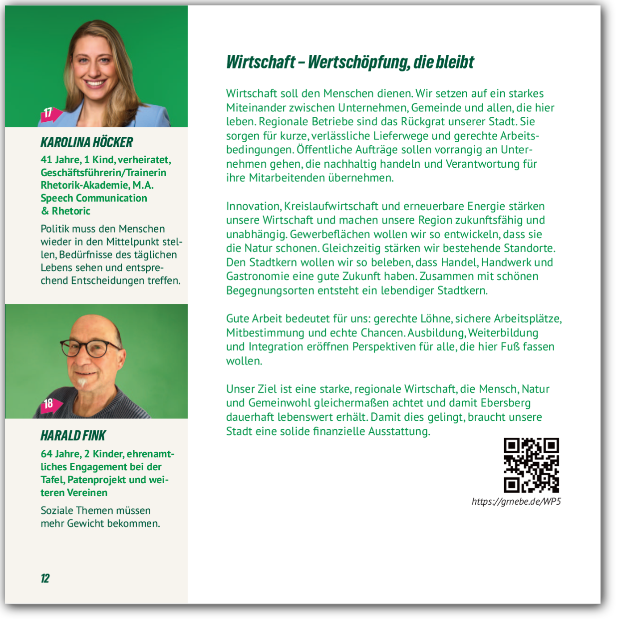 Wirtschaft soll den Menschen dienen. Wir setzen auf ein starkes Miteinander zwischen Unternehmen, Gemeinde und allen, die hier leben. Regionale Betriebe sind das Rückgrat unserer Stadt. Sie sorgen für kurze, verlässliche Lieferwege und gerechte Arbeitsbedingungen. Öffentliche Aufträge sollen vorrangig an Unternehmen gehen, die nachhaltig handeln und Verantwortung für ihre Mitarbeitenden übernehmen.