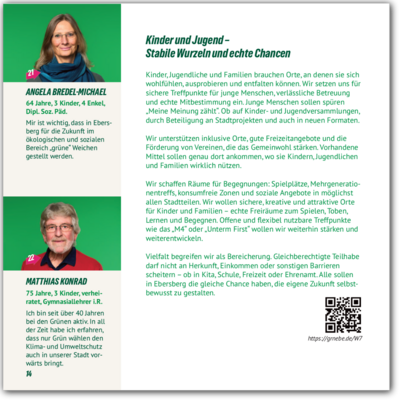 Gerade in Zeiten von Krisen und Zukunftsängsten brauchen junge Menschen Zuversicht und Verlässlichkeit. Die Erfahrungen der Pandemie haben deutlich gemacht, wie verletzlich Kinder und Jugendliche sind. Deshalb wollen wir Ebersberg als einen Ort gestalten, an dem sich junge Menschen wohl, sicher und wertgeschätzt fühlen. Für uns gilt: Nicht über Kinder und Jugendliche reden – sondern mit ihnen.