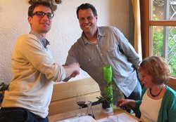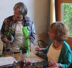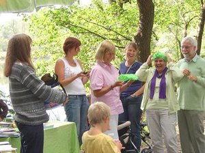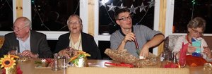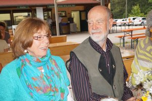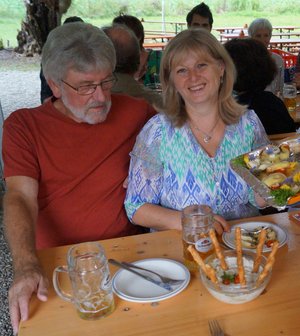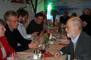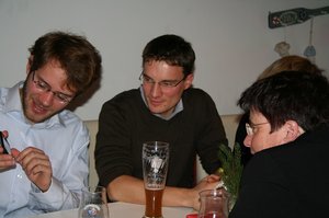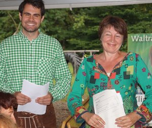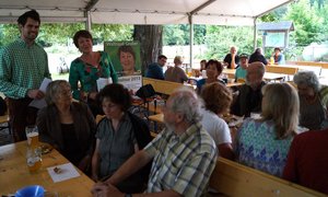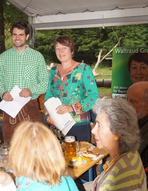 Es folgte eine kabarettistische Einlage mit realpolitischem Inhalt: Matthias Konrad, Gründungsmitglied des Grünen OVs Ebersberg und gebürtiger Bamberger, ließ durch den Mund des Franken Erwin Pelzig so manche Vorkommnisse in unserem oberbayerischen Landkreis in neuem Licht erscheinen. Als Dr. Göbel verzichtete Matthias auf keine kritische Stellungnahme zu den aus dessen Sicht oft so befremdlichen Vorschlägen der Grünen und als Hartmut, gab er unvermeidlichen Senf dazu. So konterte Erwin Pelzig Einwände des stockkonservativen Dr. Göbel: "Göbel, eens kann ich dir sag: Der Block und die Klee, die Leng, und alle die andern, die zieng druch! Die machen erst dann Pause, wenn dei Söder-Haufen auf Normalmaß zurechtgstutzt is!"
