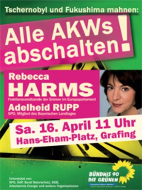 Der Ortsverband und der Kreisverband der Grünen lädt zu einer Kundgebung gegen die weitere Nutzung der Atomenergie am Samstag, 16. April, 11 bis 12 Uhr auf dem Hans-Eham-Platz in Grafing. Unterstützt wird die Veranstaltung von SPD, ÖdP, Bund Naturschutz, DGB und verschiedenen Arbeitskreisen und Umweltorganisationen.