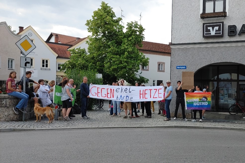 Obwohl alles sehr kurzfristig organisiert werden musste, kamen viele, die der Rechten Hetze Kante zeigen wollten. Neben der Grünen Jugend und den Grünen kamen Vertreter*innen von "Bunt statt Braun", vom Kreisjugendring und diversen Parteien sowie Privatpersonen. Ein paar kurze Reden, gute Musik und ein weit sichtbares Banner – so war die Gegendemo deutlich spannender, bunter und lustiger. Während am Marktplatz zunächst wenig passierte.