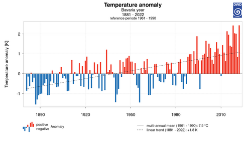 In Bayern war 2022 das wärmste Jahr seit Beginn der Aufzeichnungen mit +2,4 Grad C über dem Mittel der Jahre 1961 bis 1990 (Quelle: Deutscher Wetterdienst DWD https://www.dwd.de/EN/ourservices/zeitreihen/zeitreihen.html?nn=24778#buehneTop ).