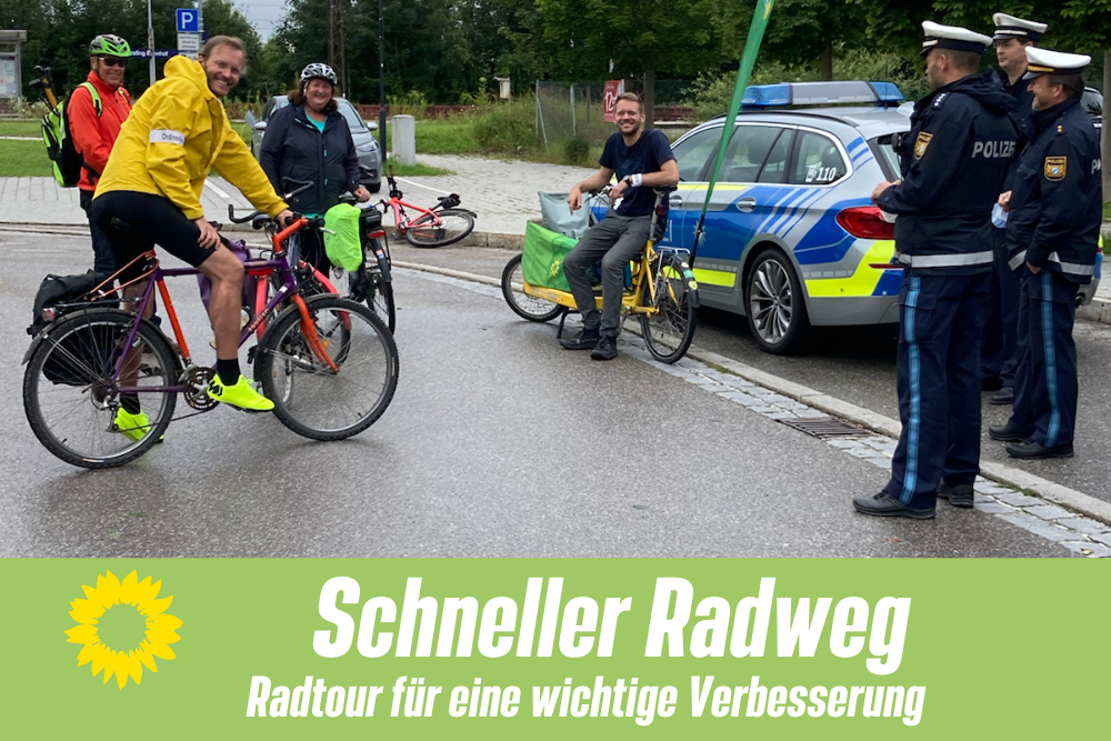 In Grafing Bahnhof startete die Radltour am 01. August zum schnellen Radweg mit fünf Personen. Mit dabei unser Diretkandidat für den Bundestag Christoph Lochmüller und der Bayerische Landesvorsitzende Thomas von Sarnowski. Und sogar drei Polizeiautos als Eskorte. Diese sollte sich später, als die Gruppe auf 40 Personen angewachsen war, als sehr hilfreich erweisen, denn so konnten große Straßen für unsere Querung gesperrt werden. Wäre sehr schön, wenn die Fahrt auf dem zukünftigen Radweg auch so störungsfrei fließen könnte!