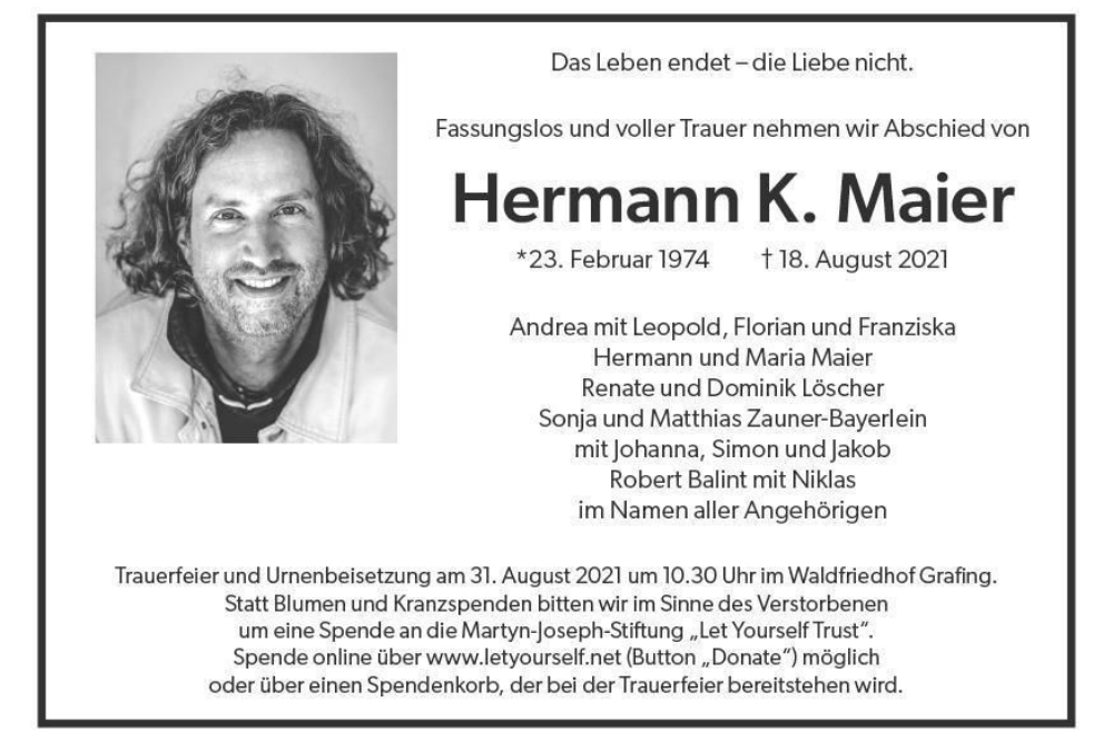 Statt Blumen und Kranz spendet bittet die Familie im Sinne des Verstorbenen um eine Spende an die Martyn-Joseph-Stiftung "Let Yourself Trust". Spende online über www.letyourself.net (Button "Donate" möglich oder über einen Spendenkorb, der bei der Trauerfeier bereitstehen wird.