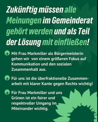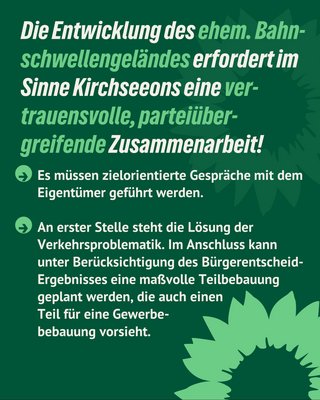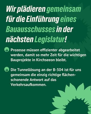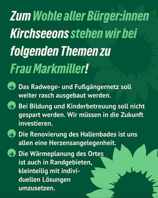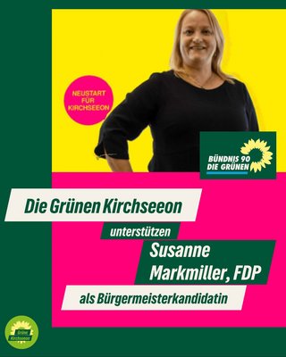 Da wir Kirchseeoner Grünen zur Wahjl am 8. März 2026 keine eigene Bürgermeisterkandidat:in stellen, ist es uns wichtig,, unsere Unterstützung für jemanden auszusprechen,, der mit Sachverstand, sozialem Engagement und pragmatischer Vorgehensweise so wie wir die Ziele für alle Kirchseeoner Bürger:innen in fairer und respektvoller Weise voranbringen will.