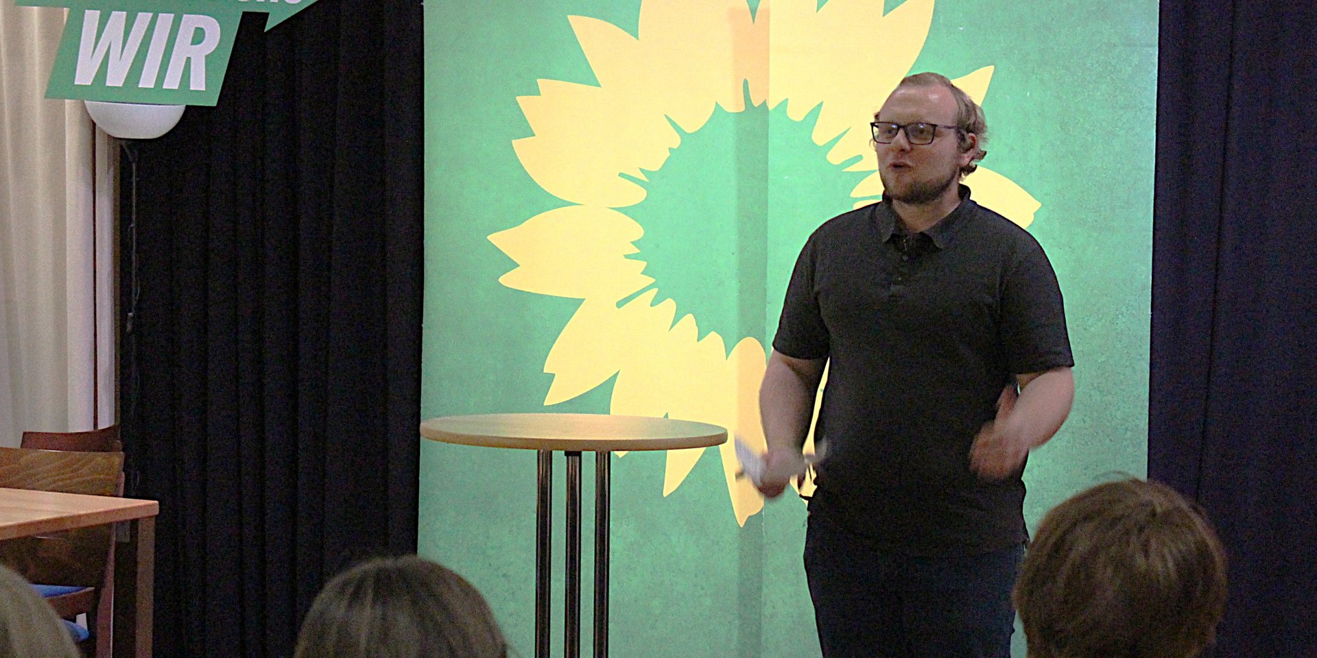 Für Marius Schlosser, den Bezirksvorsitzenden der GRÜNEN Oberbayern, ist der Abend Anlass darüber nachzudenken, wie viel Arbeit und Engagement in einem aktiven Ehrenamt in einer Partei stecken. Er beginnt mit Hermann Hesses „Und jedem Anfang wohnt ein Zauber inne“, um richtig zu stellen - es dauere eine Zeit in der Kommunalpolitik, „bis wirklich der Zauber innewohnt“, denn die Einarbeitung in all die Themen erfordere Zeit. Um die Lust auf politische Arbeit zu unterstützen, gäbe es Bildungsangebote vom Landesverband und Stiftungen, aber auch viele erfahrene Parteimitglieder im Landkreis. Als Erinnerung an den Abend brachte der Bezirksvorsitzende dem neuen Vorstand deren erste GRÜNE Fahne als Geschenk mit.