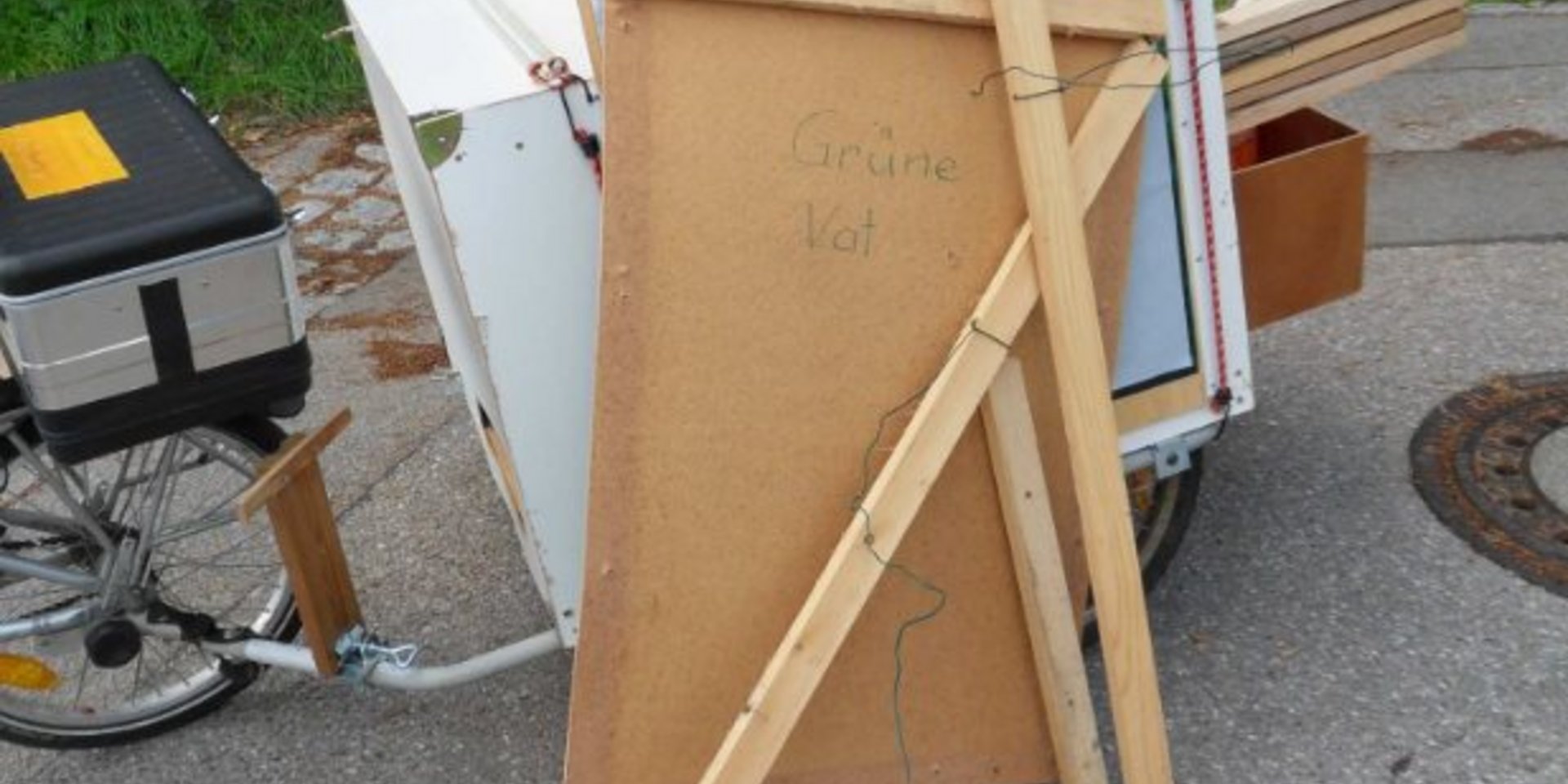 Zu sehen wäre, wie das "Spitzenduo" der CSU dank schlecht befestigter Plastikplatae (=Vordermann-Plakate zum wegwerfen) im heftigen Wind herum geschleudert werden.