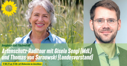 Was bringen solche Ausgleichsflächen z. B. von KraussMaffei und BMW und wie sehen sie aus? Genau das schauen wir uns an - zusammen mit der Landtagsabgeordneten und Sprecherin für Ernährung und Landwirtschaft Gisela Sengl und dem Landesvorstand Thomas von Sarnowski.