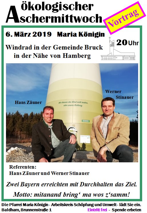 Die beiden Referenten Hans Zäuner und Werner Stinauer schildern den langwierigen Werdegang bis hin zur Errichtung der Windanlage bei Hamberg. Eine rege Diskussion ist zu erwarten.