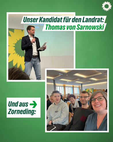 Auch für den Kreistag haben wir einige engagierte BürgerInnen aus Zorneding, die sich für eure belange auf Kreisebene einsetzen möchten! Mit Anne Gattinger (Platz 7), Silvia Apel (Platz 15), Moritz Dietz (Platz 24) und Helmut Obermaier (Platz 60) ist unsere Gemeinde auf der Kreistagsliste der Grünen im Landkreis Ebersberg vertreten. Angeführt von Sarah Onken und unserem Landratskandidaten Thomas von Sarnowski auf den ersten beiden Plätzen gehen wir voller Zuversicht in den Wahlkampf! Die ganze Liste findest du hier.