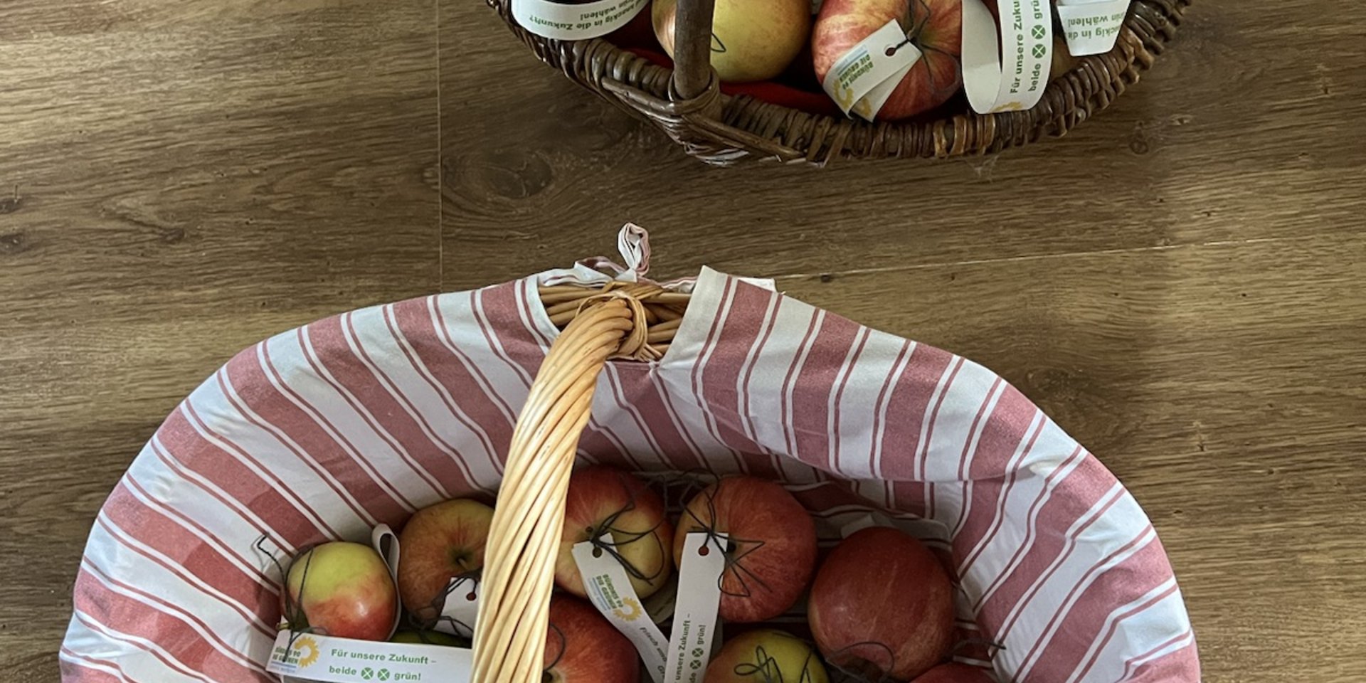 4 Körbe mit Bioäpfeln und Grünen Slogans wurden an der S-Bahn in aller Frühe sehr gerne angenommen. In erstaunlich kurzer Zeit waren alle weg und die Verteiler*innen mit der Aktion sehr zufrieden.